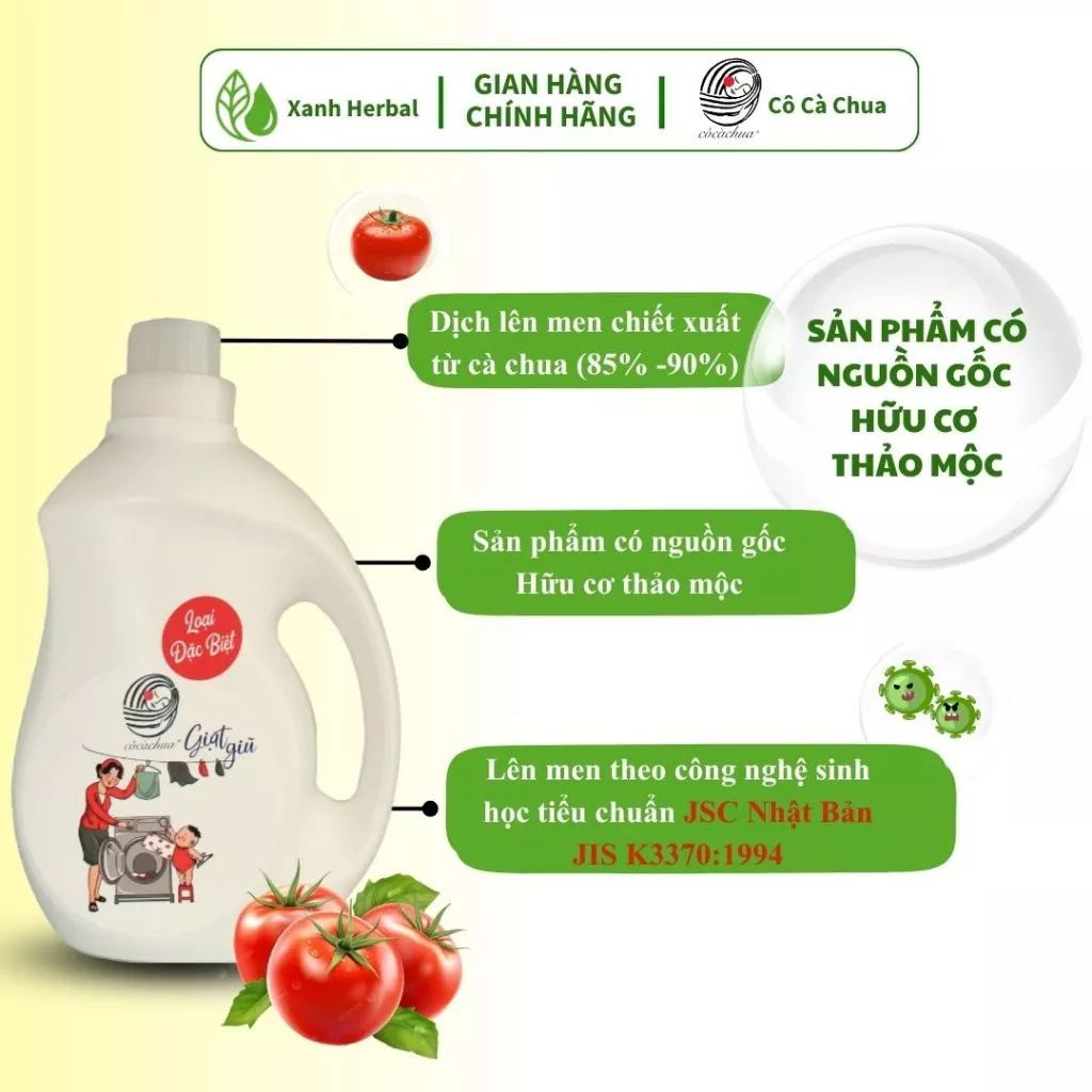 Nước giặt thiên nhiên Cô Cà Chua, an toàn cho mẹ và bé. Sử dụng công nghệ lên men và gia nhiệt, làm sạch, khử mùi trong 8s. Tinh dầu Oải hương có tác dụng trị liệu. Sản phẩm giữ chặt nắp, càng để lâu càng dịu và tốt hơn.